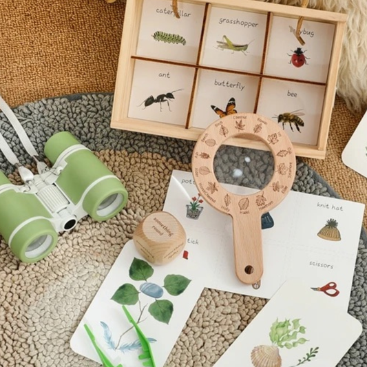 Wooden Explorers Pack Field Binoculars with Specimen box Magnifier Glass Sensory Tools Nature With Flash Cards