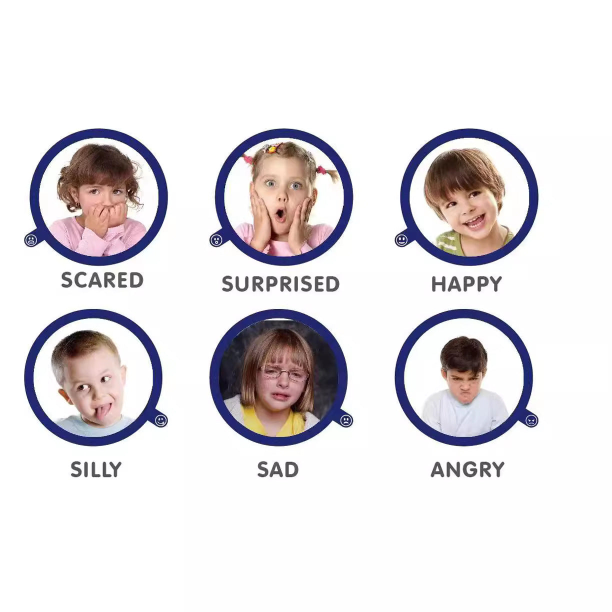 Side panels can show scared surprised happy silly sad angry