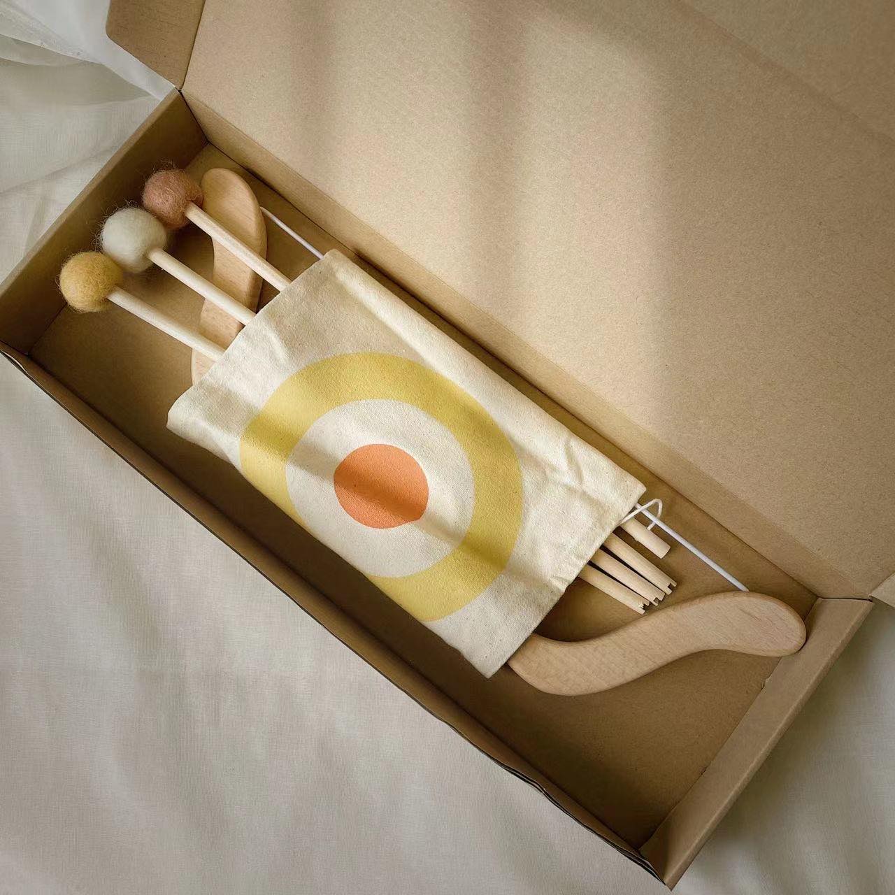 The bow is made from solid beechwood, sanded smooth with round edges and lightly coated with Australian food safe Beeswax to be comfortable for little hands. The arrows are tipped with wool felt balls, have a notch at the end, and feature lovely painted stripes. You will receive 3 arrows with your bow.Â