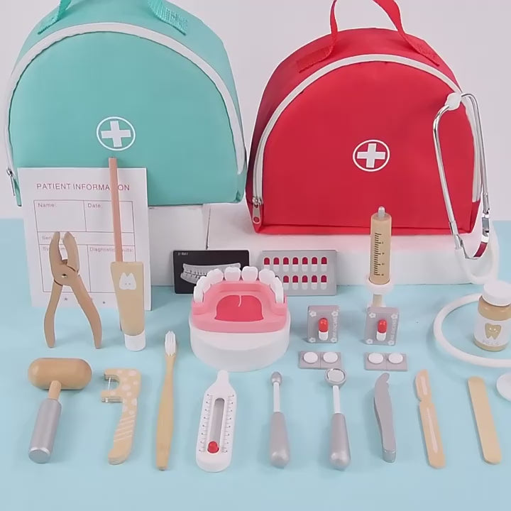 Kids Wooden Doctor Kit with Medical Bag Playset Red First Aid Kit