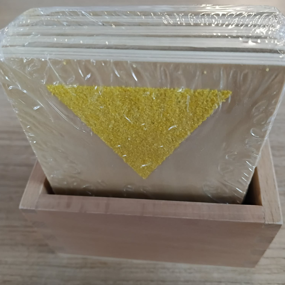 This Item presents an enjoyable geometric twist on the classic Montessori sandpaper letters and numbers. Sandpaper letters and numbers are generally introduced to children between the ages of 2.5 and 5 years, aiding in their recognition of letters and numbers through various senses: sight, touch, and sound. The tactile experience of these letters and numbers also equips the child for writing them. These sandpaper shapes can provide comparable experiences and can additionally serve as labels for sorting activities. I plan to introduce these to children so they can view and compare various objects in the real world that adhere to these basic shapes